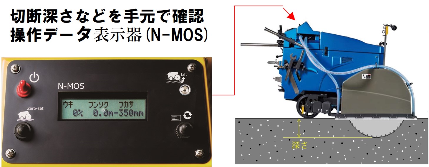 切断深さなどの機体情報を表示する操作データ表示器(N-MOS)を乾式カッターにも搭載!操作データを手元で確認することで作業者の負担を軽減し、作業効率・操作性アップ!!