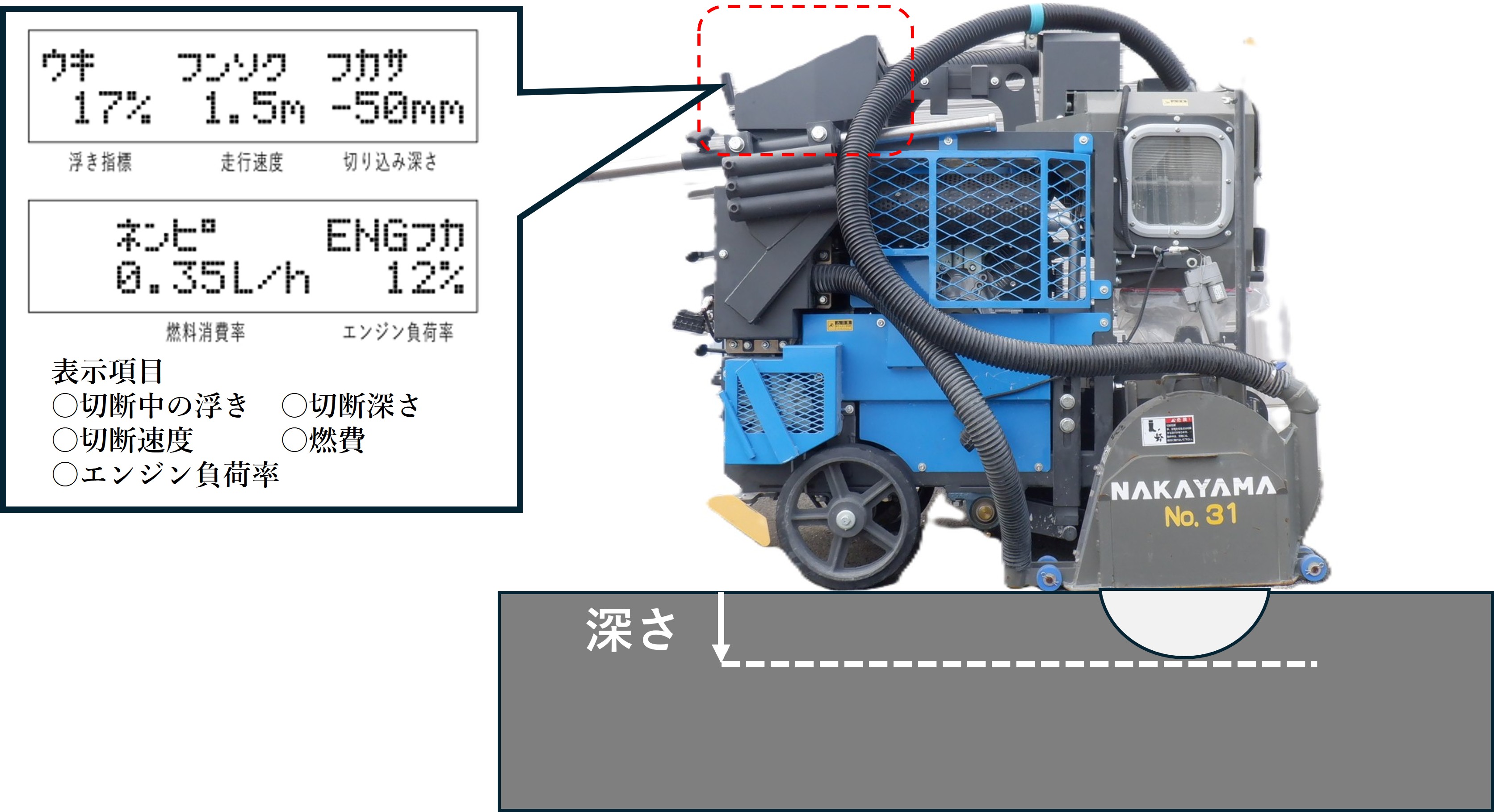切断深さなどの機体情報を表示する操作データ表示器(N-MOS)をオプション装備として新規開発